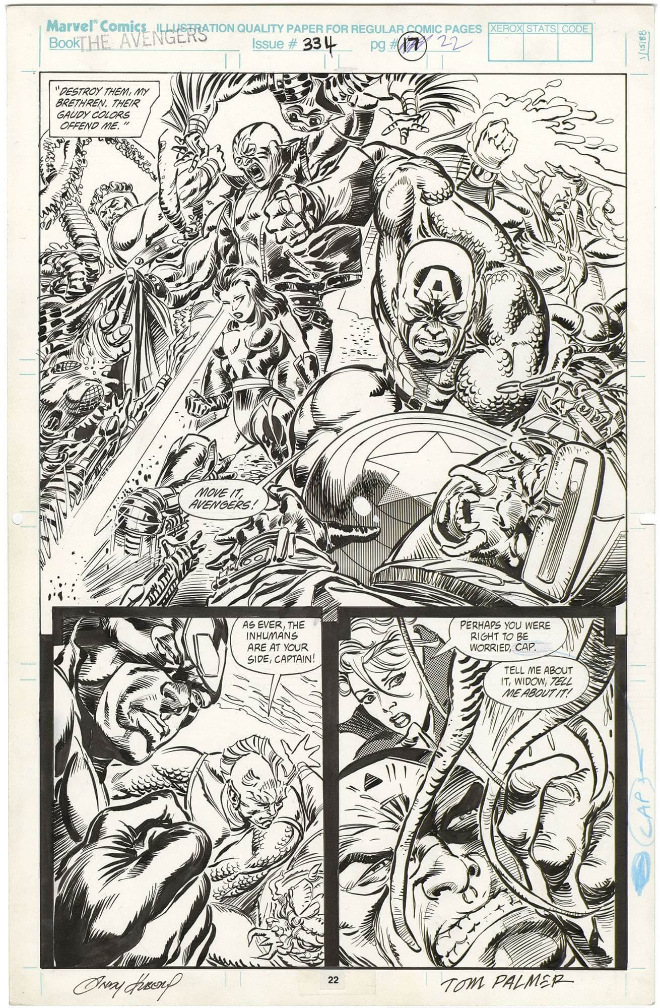 Wow — Check out all the heroes on this page! You have Captain America, Black Widow, Hercules, Triton, Rage, Quasar, and Sersi. Cap looks ferocious on this beautifully drawn page by Andy Kubert.