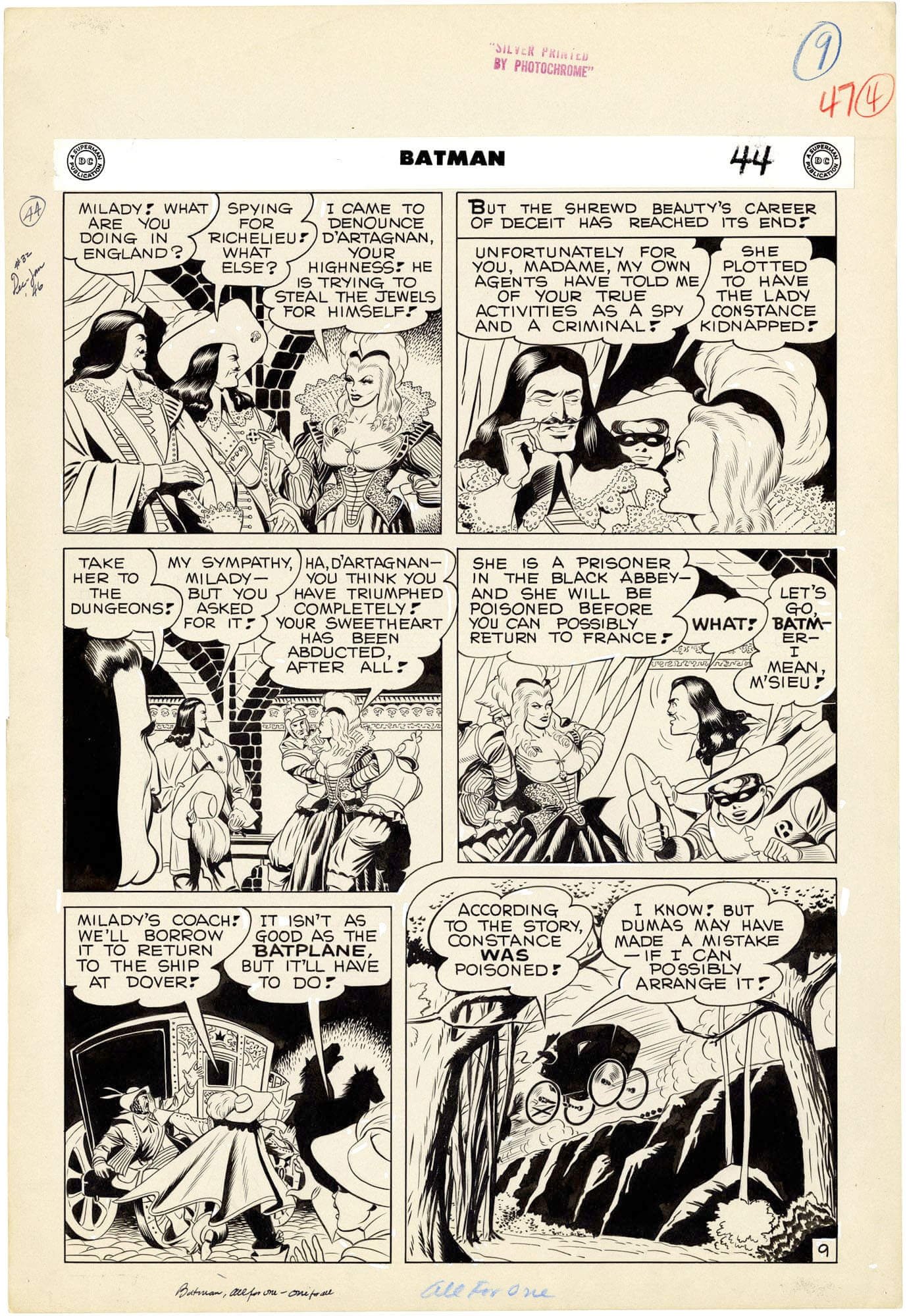 This is the only surviving work from the Golden Age of comics that is both penciled and inked by Dick Sprang. The only reason it survived is that Sprang requested for the story to be sent back to him as he was a huge fan of Alexander Dumas and in particular the story The Three Musketeers. Here’s a wonderful page from the story where Batman is disguised as D’Artagnan and Robin is helping him to uncover the scheme of Milady. This really belongs in a museum, in a special section dedicated to the history of comics.