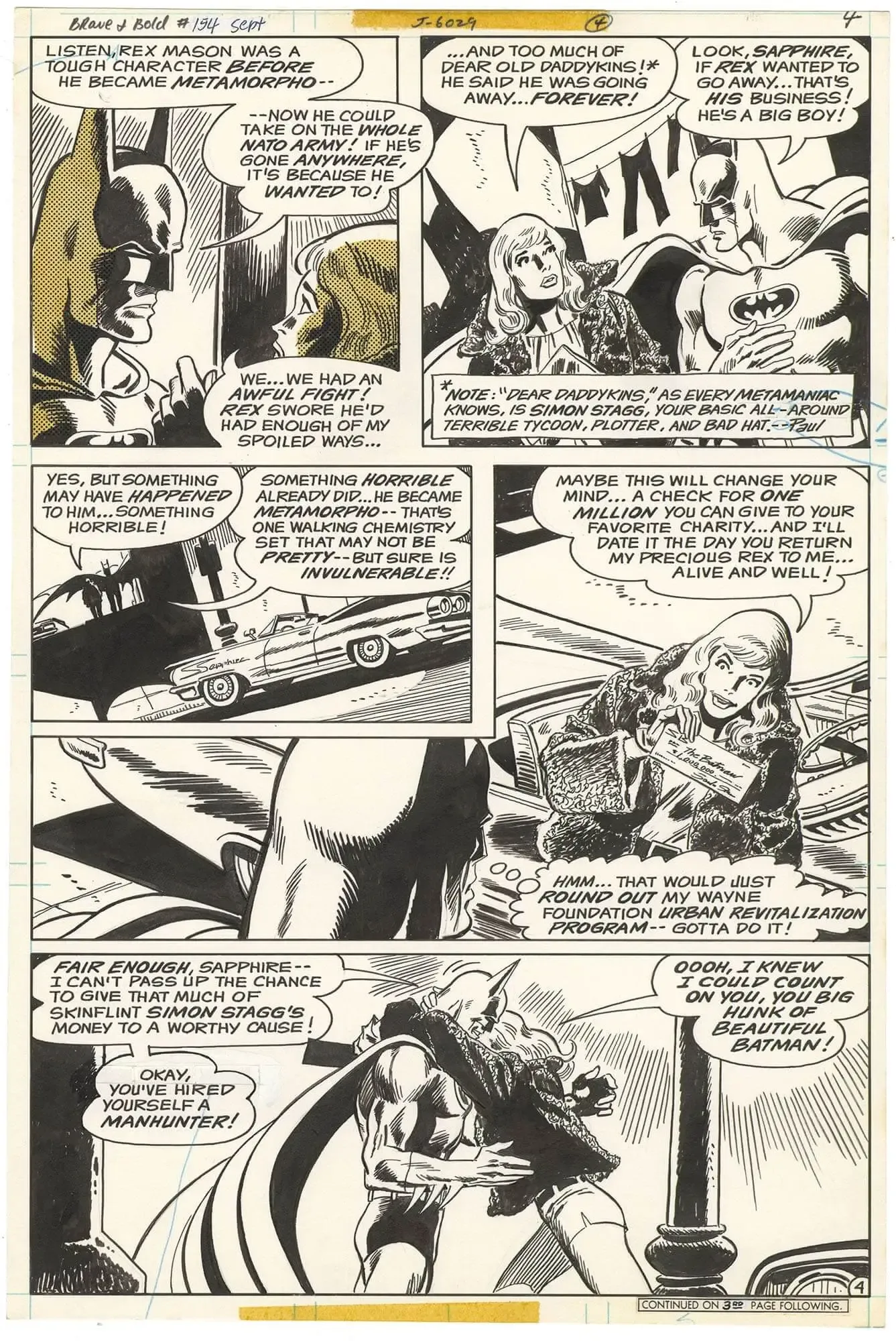 Just another wonderfully drawn Batman page by Aparo. I love the use of the zippertone in the first panel. Get a load of the smiling Batman as he’s practically molested by Sapphire.