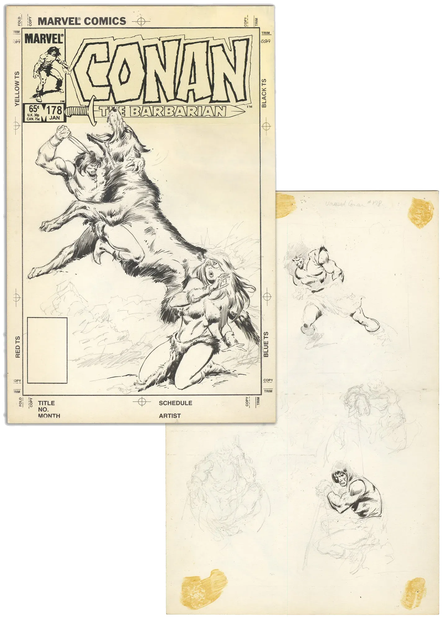 Look up the cover they used instead of this cover, there is no comparison. This one is so far superior. The girl in this cover is sublime. Having it slightly unfinished adds, not subtracts, from the piece. Seeing Buscema working on Conan in the back of the cover is rewarding for the insight it gives us. Condition: This piece at one time had the top right corner missing, an area you can clearly see from the back image. It was professionally restored and looks great.