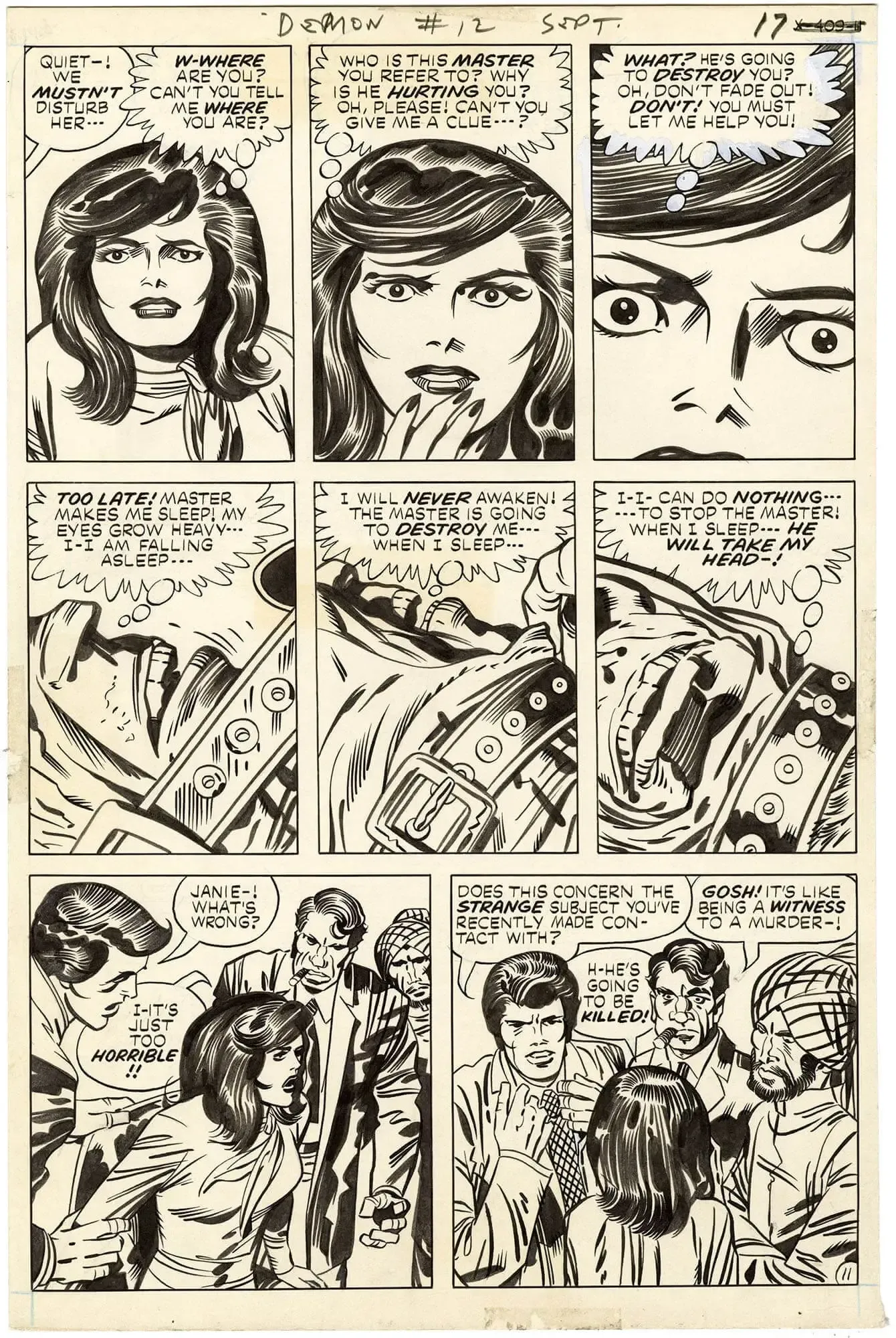 ESP is real between Janie and The Monster. An emotionally charged page Kirby-designed with in-your-face storytelling panels. Especially take a close look at the 3 panels of the beautiful girl and the corresponding 3 panels of the monster.