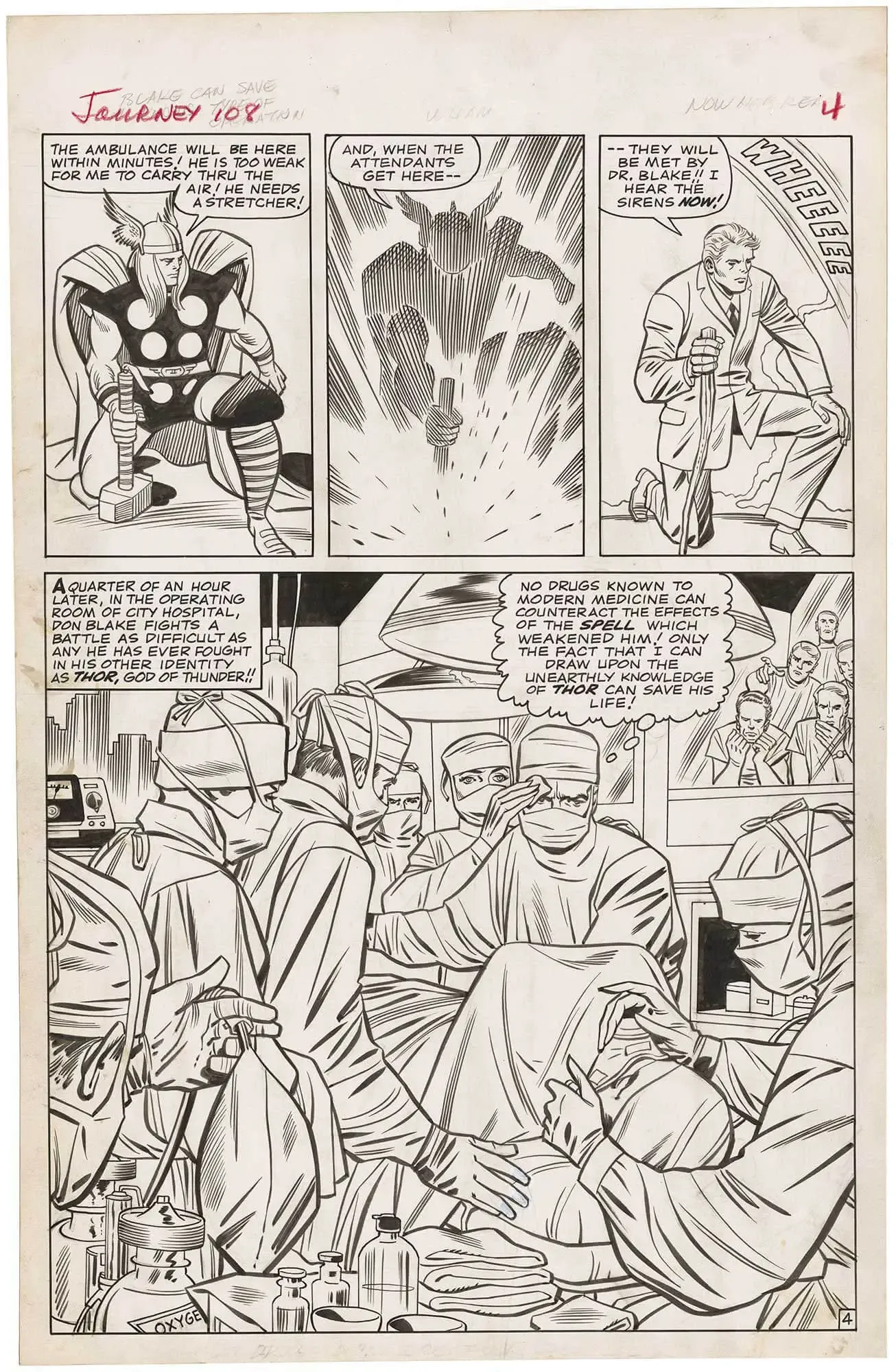 Doctor Don Blake, aka Thor, saves Doctor Strange's life. The first three panels are, arguably, perfect images if you’re a Thor fan. They are exquisite transformation panels. The bottom splash is gorgeously inked by Chic Stone. If I was a doctor I would have to have this page for my collection.