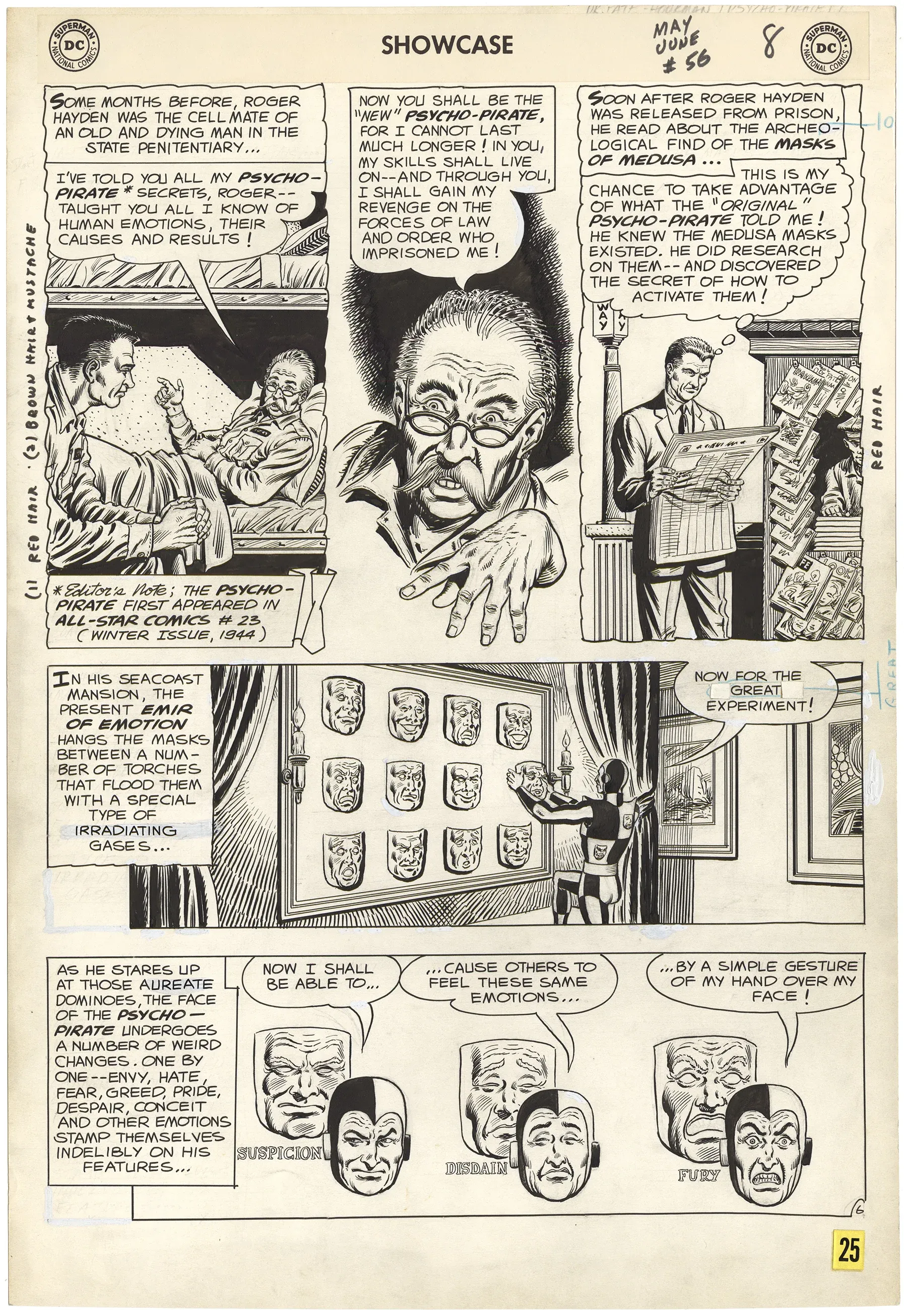 If I haven’t said that my favorite art combo in D.C. is Murphy Anderson pencils with Murphy Anderson inks, then I should. Did you know two of the most sought after issues to get art from in D.C. are from Showcase 55 and 56. Here we have a fun page featuring the villain, Psycho-Pirate, from issue 56. Did you also notice that this page is from Jerry Bails’ collection as indicated by the number 25 in gold at the bottom right of the page?