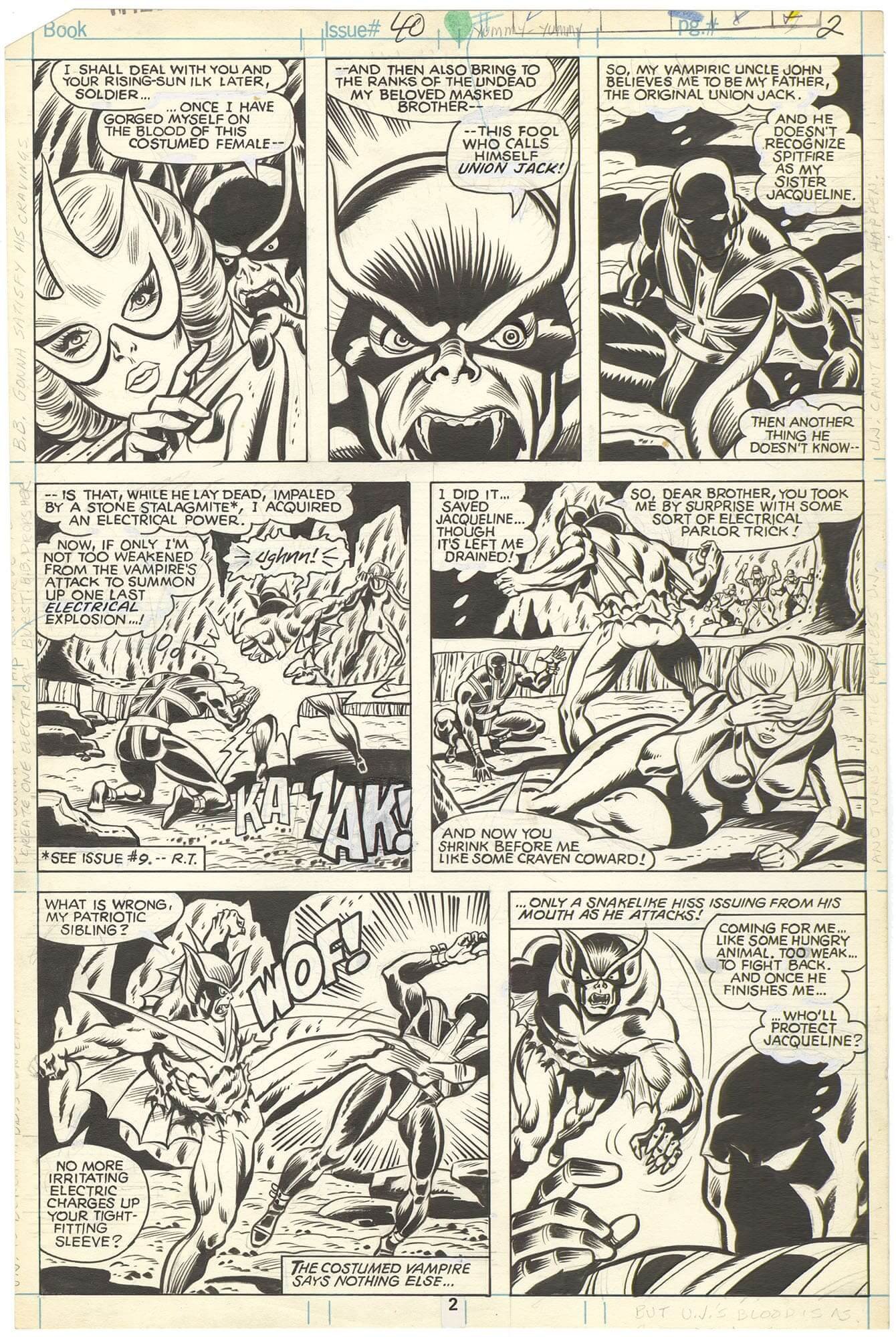 Who needs to see the Invaders when you have Baron Blood, Union Jack, and Spitfire on a page. They are much rarer to find and they’re battling to boot! I love the three closeup shots of them in the top panels. Chic Stone’s inks look wonderful on this page.