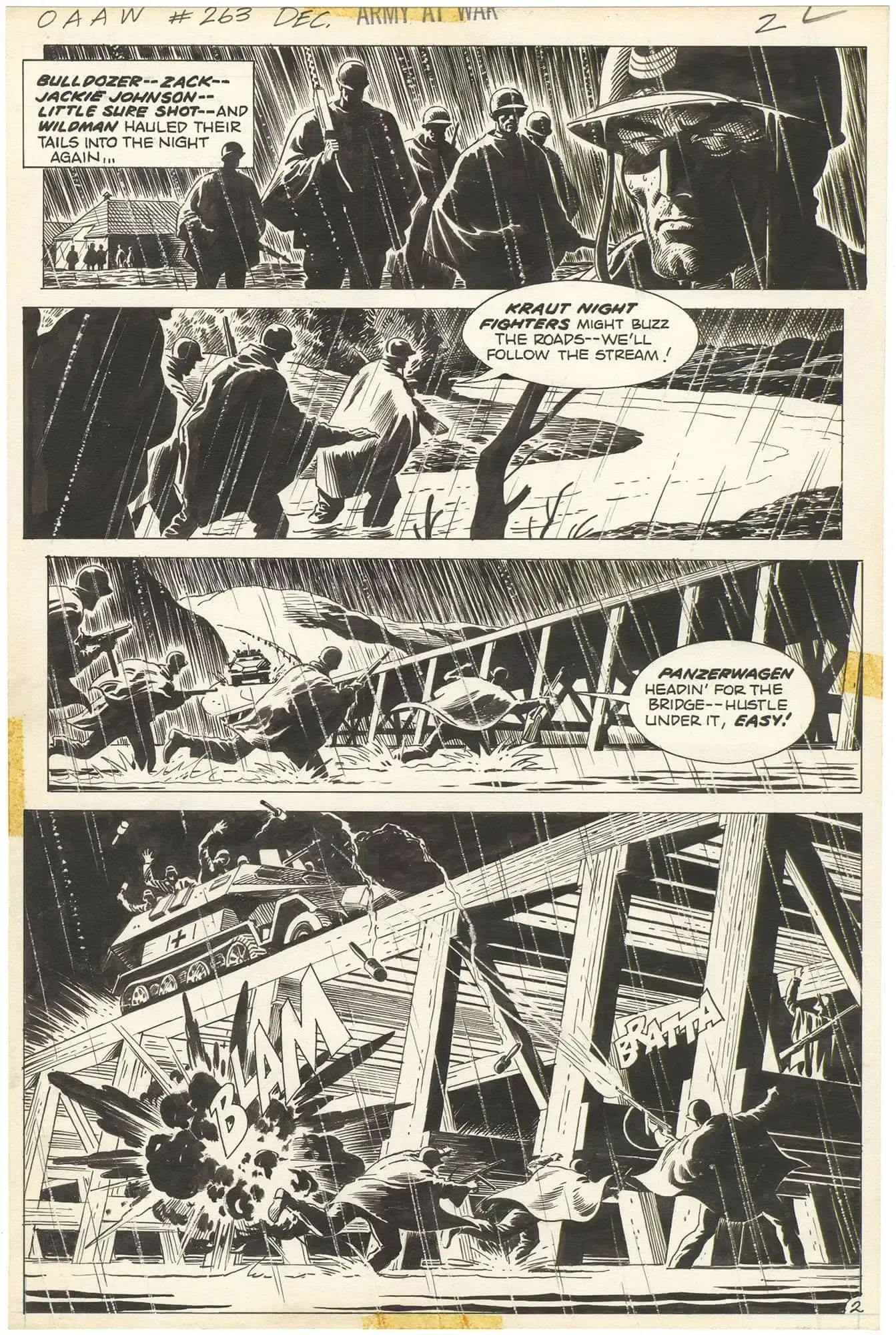 If you’re a Russ Heath fan or you love war art this page should cry out to you. It has so many elements to appreciate. The element of rain and night time works wonders to elicit mood. The shadowing on Sgt. Rock's face is captivating. Having Easy Company take on a Panzer is just plain old fun, especially in the artistic hands of Russ Heath.