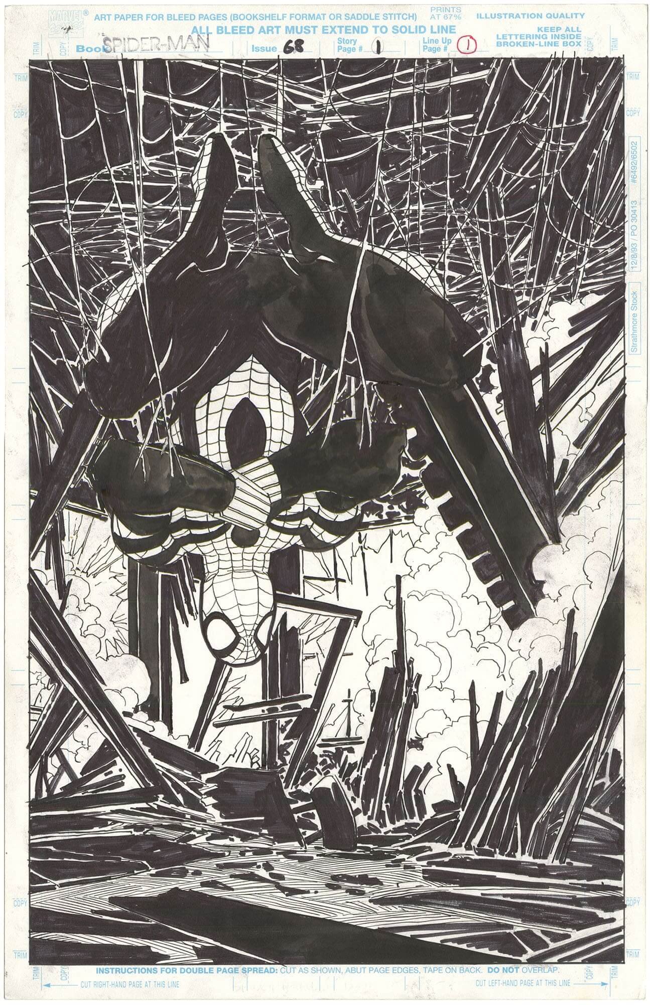 A few years ago I offered up a nice Spider-Man Romita Jr. splash, but this one is the best I have ever seen. It’s an all black background, full of webbing, and Spidey is hanging upside down. Truly a wonderful piece of art.