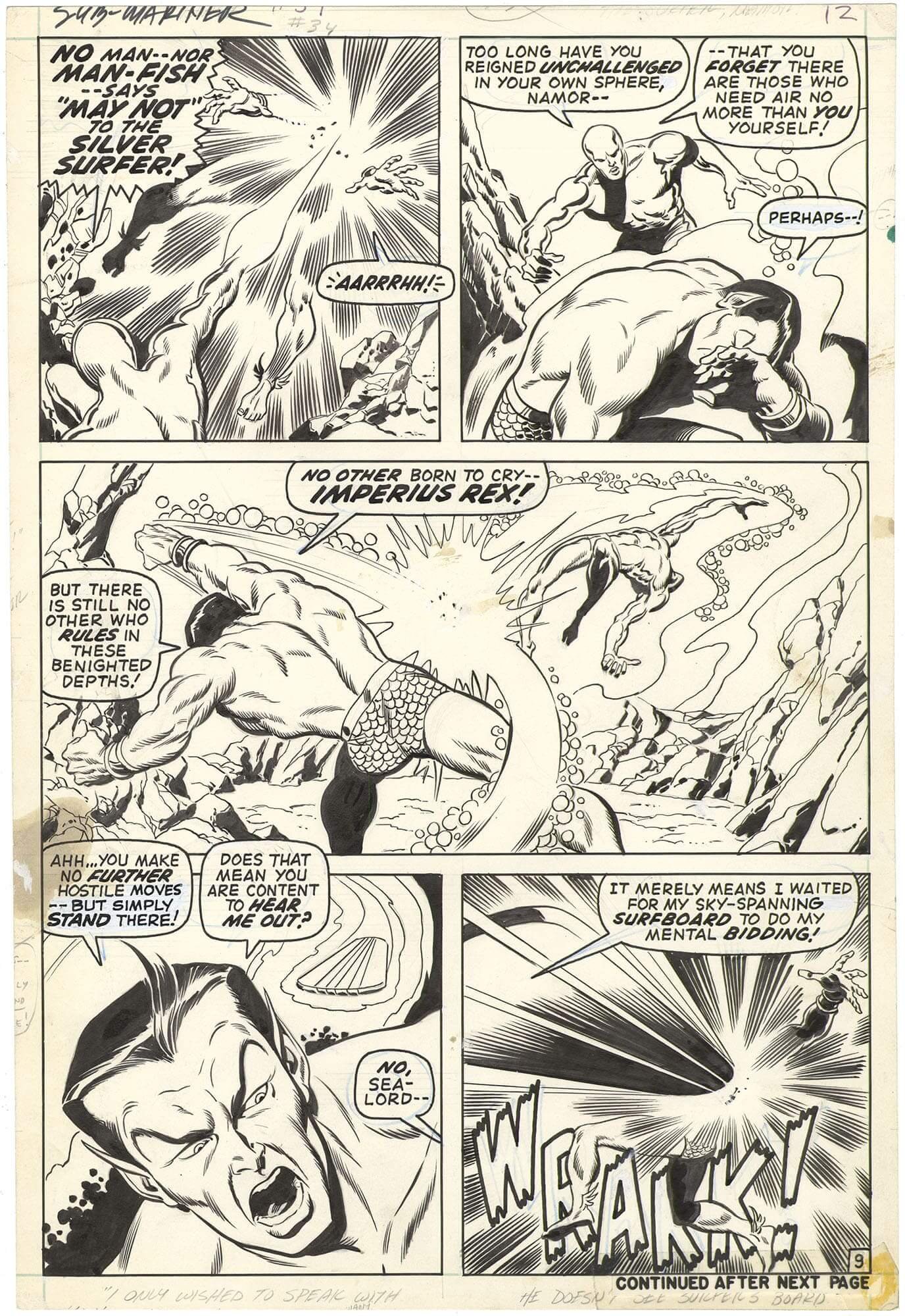 This is an extremely special page in the annals of Marvel from the 70’s. This page features the first meeting with the Sub-Mariner and the Silver Surfer which culminates in an all out battle between the two.They will reconcile their differences and join forces with the Hulk. This will herald the beginning of their teamup and the start of the Defenders. Certainly growing up this was my favorite group, alongside the Avengers, because it had the Silver Surfer, who is still my favorite hero. These are the kind of pages that the new wave of collectors that are coming in from the comic book world are looking for, which has some kind of origin or first appearance.